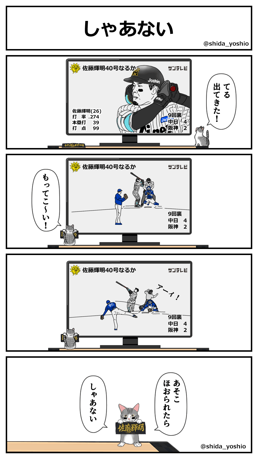 ここは球児、打順入れ替え頼むで。最多安打の可能性はゼロやないし1番は近本でいくとして、2番はテル、3番は原口や。あと中川はもう出したらあかんで。新人王の資格なくなってまう。